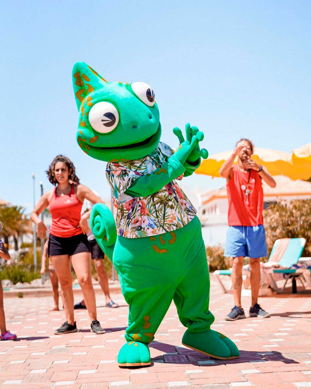 Por otra parte, Leo, el camaleón mascota del hotel hace de vez en cuando su aparición y lo niños se tiran encima de él para bailar, abrazarlo y tomarse fotos. Es todo un momentazo.