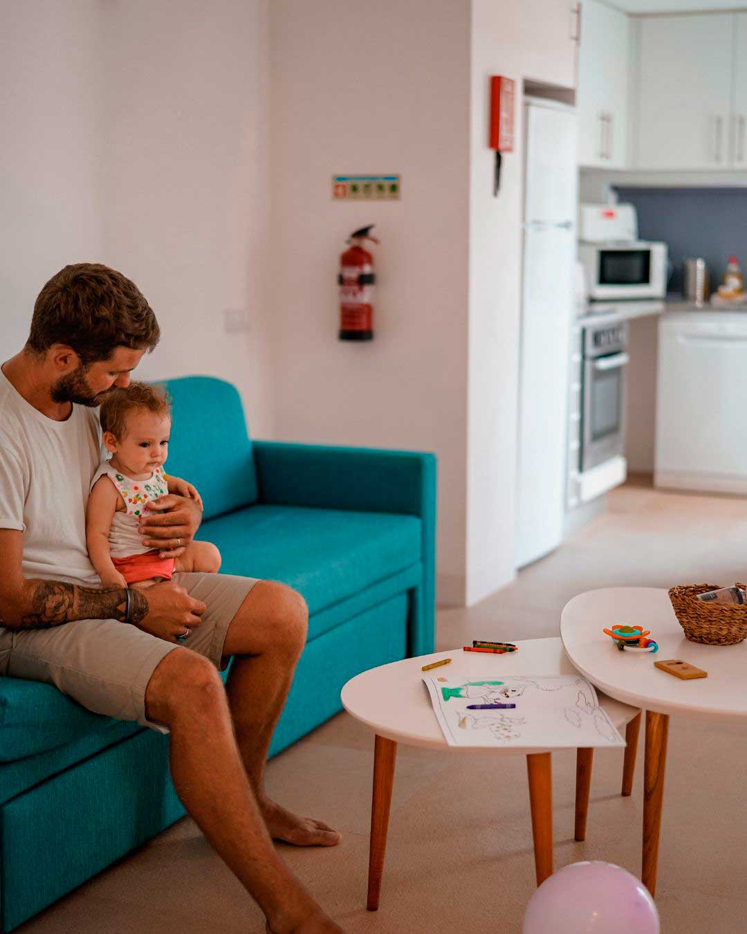 Nosotros pasamos cuatro noches en un Estudio T1 Plus Sunset con capacidad para tres adultos y dos niños hasta los 12 años. De hecho, tenía dos habitaciones, un sofá cama, baño, salón espacioso, cocina equipada y terraza con también mesa y sillas para comer fuera.