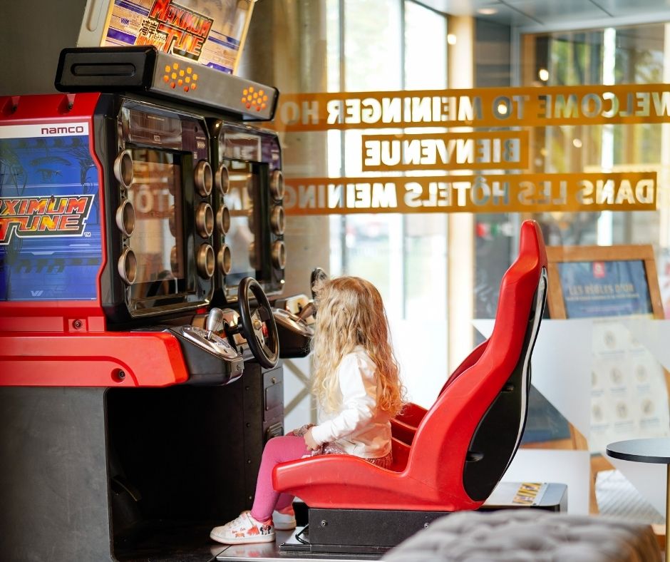 Nuestra pequeña Avril de 4 años disfrutó en la zona de juegos con el futbolín, pintando en la pizarra, con los sillones de colores o con los simuladores de coches.