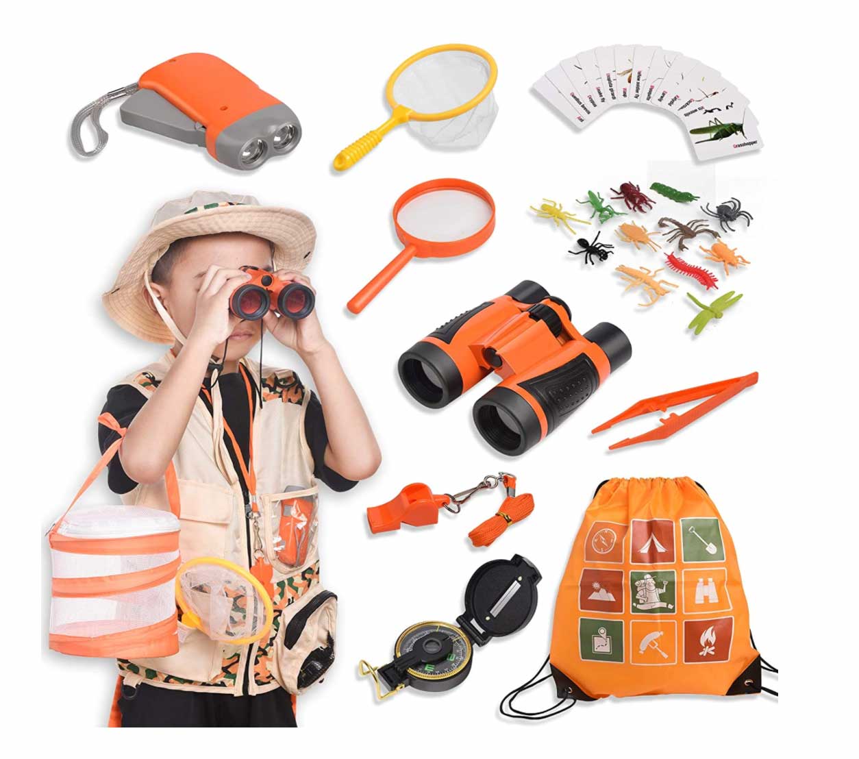 Incluye: insectos, binoculares, lupa, sombrero y chaleco de explorador, linterna, brújula, estuche para guardar bichitos, silbato, tarjetas para identificar insectos, red de mariposas, mapa del tesoro y mochila.